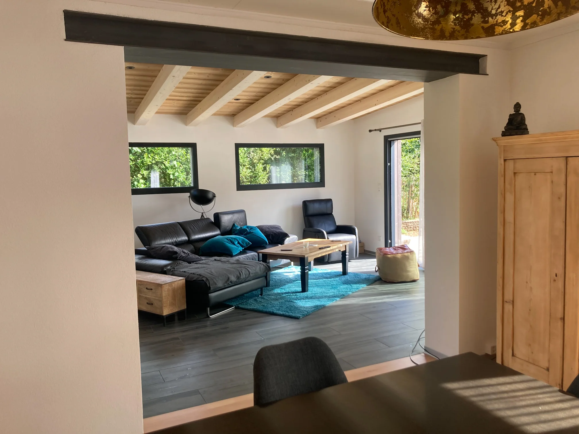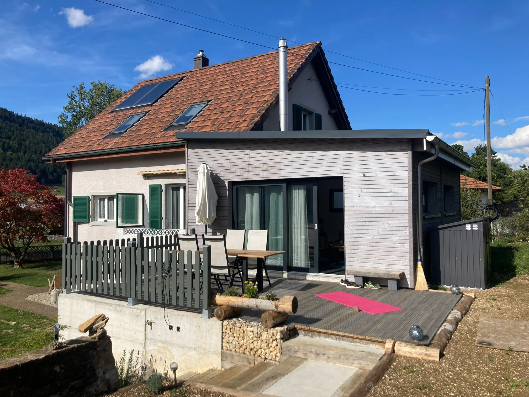 Petite extension entièrement en ossature bois. La pièce supplémentaire vient agrandir le séjour côté Sud. Une terrasse vient compléter la construction permettant un accès direct sur le jardin.