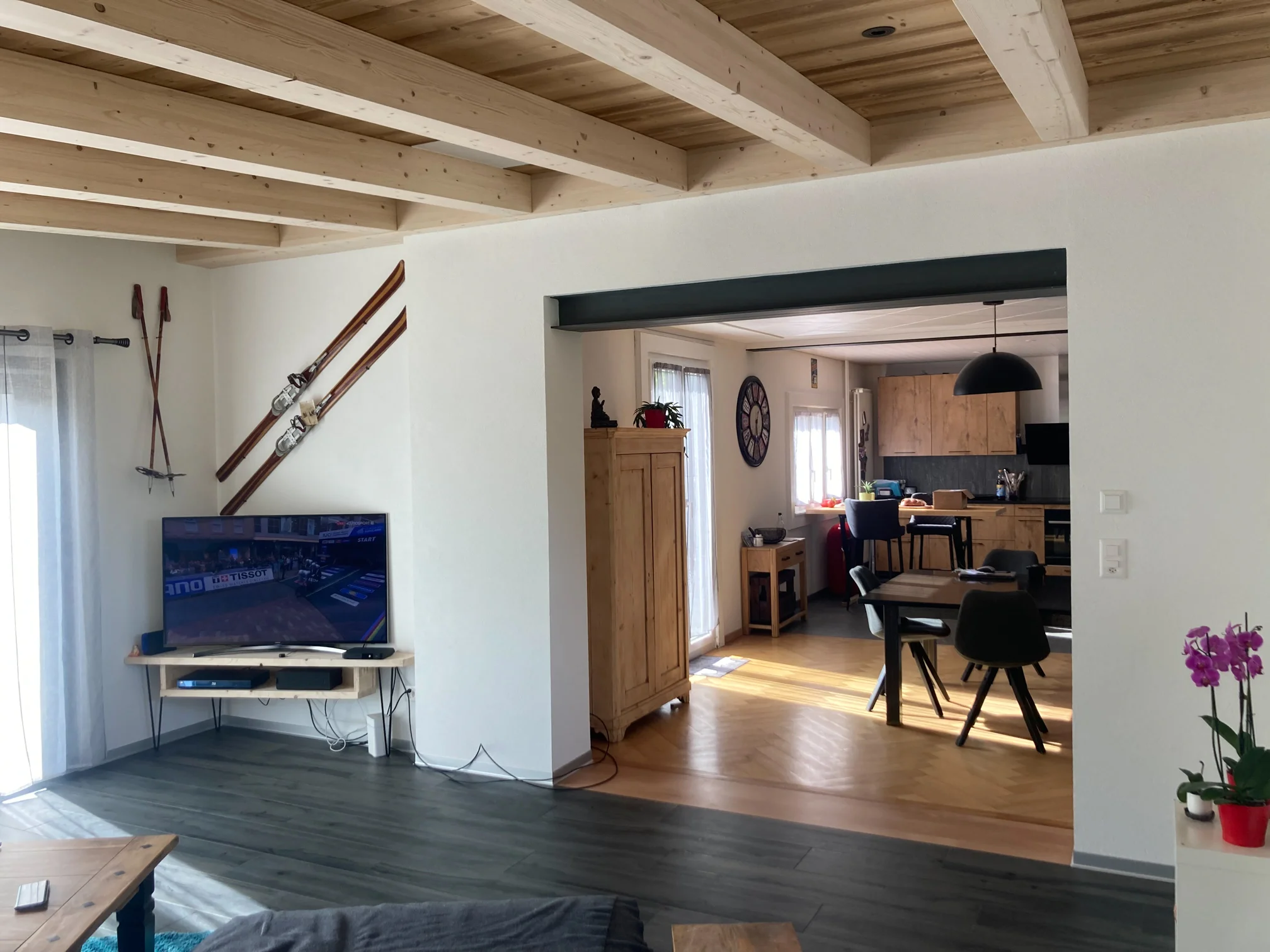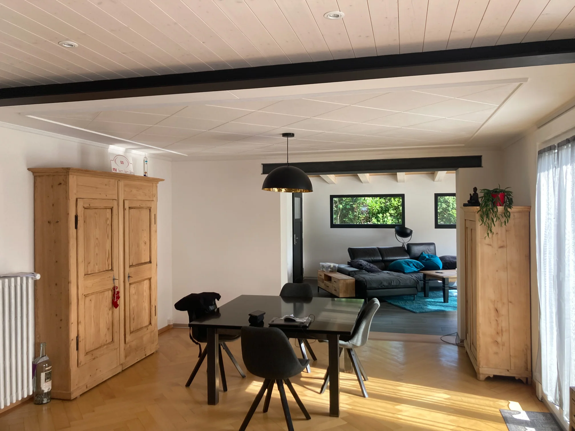 L’intérieur reste sobre et discret, les murs sont blancs et les cadres des fenêtres anthracite viennent rehausser légèrement l’ambiance. Seule la toiture s’affirme en laissant les poutres apparentes.